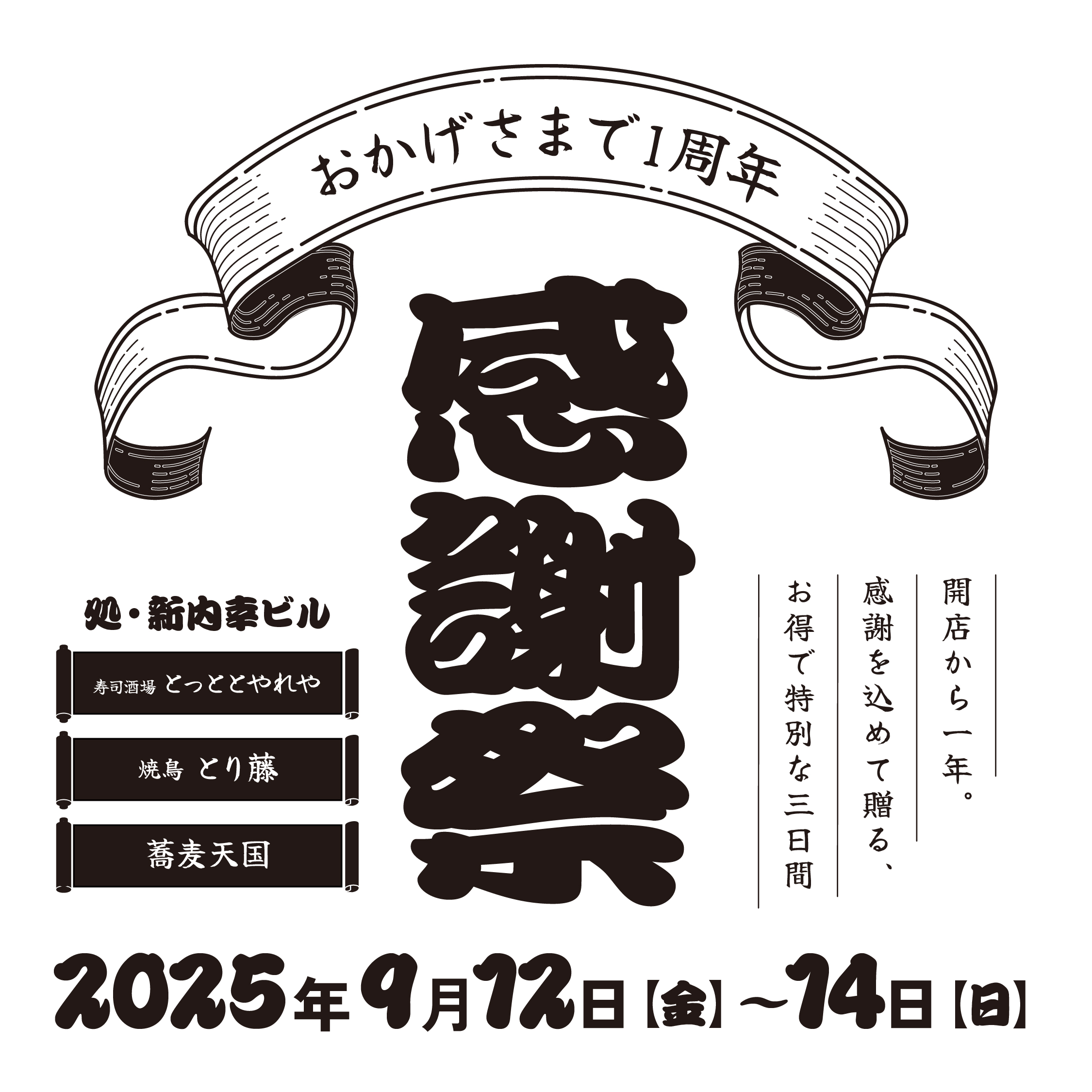 寿司劇場とっととやれや、蕎麦天国、焼鳥とり藤1周年!!